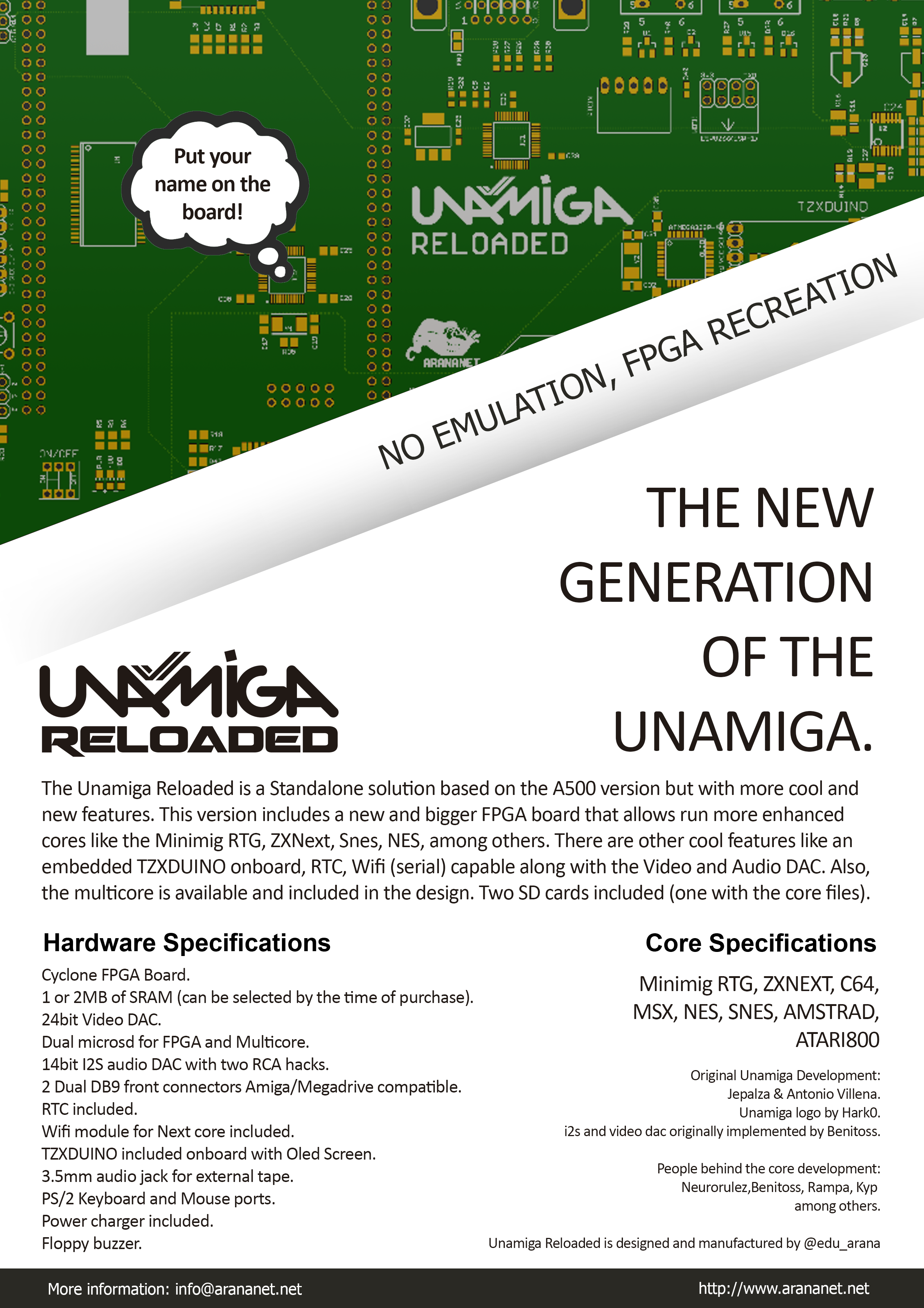 The Unamiga Reloaded is a Standalone solution based on the A500 version but with more cool and new features. This version includes a new and bigger FPGA board that allows run more enhanced cores like the Minimig RTG, ZXNext, Snes, NES, among others. There are other cool features like an embedded TZXDUINO onboard, RTC, Wifi (serial) capable along with the Video and Audio DAC. Also, the multicore is available and included in the design. Two SD cards included (one with the core files).