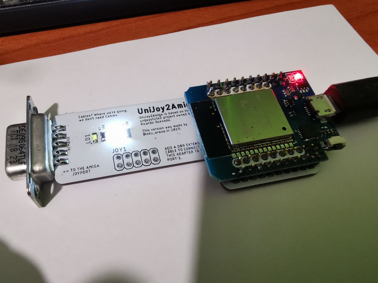 To pair a DPAD on the UniJoy2Amiga, first connect the UniJoy2amiga to the amiga, connect the power cord on the ESP32 Module (micro usb b). Then Start the Amiga. After that, hit the bluetooth sync button of your joystick or dpad to allow the sync. If the sync was made correctly, the led L2 will stay ON always. If your joystick does not pair, try hitting the bluetooh button from your dpad again, and sonner after that reset the ESP32. There is a reset button on the left of the board.